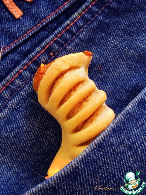3. Нет смысла раскатывать отдельно лепешки для каждой колбаски и вырезать прямоугольники. Просто раскатайте большой пласт, нарежьте ленты ,разложите ваши колбаски и сверните их. Все гораздо быстрее.