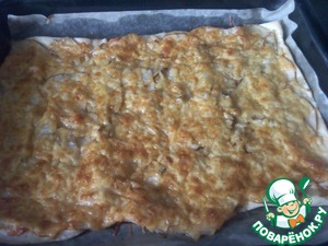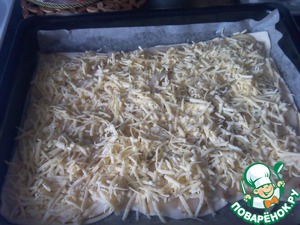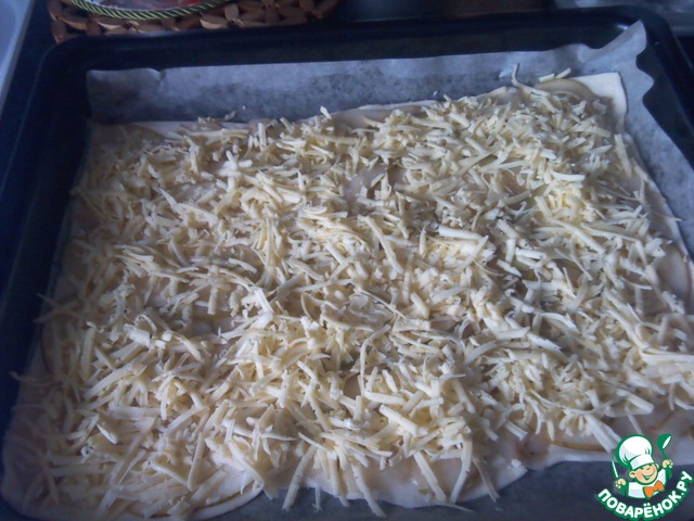 Раскатать тесто ( мы использовали три пласттины на лист), на него выложить грушу и сверху засыпать тертым сыром. Выпекать при 180-200 градусах 15-20 мин