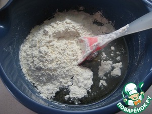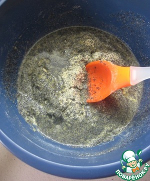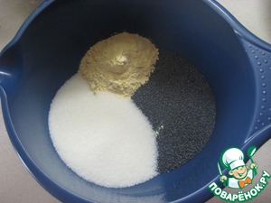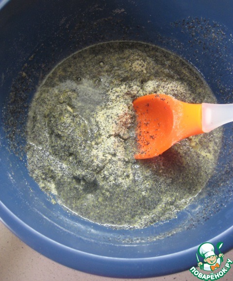 К настоявшейся маково-кукурузной смеси добавить растительное масло, ванильный сахар, просеянную пшеничную муку и разрыхлитель. Тщательно перемешать (тесто получается густое, с ложки не стекает).