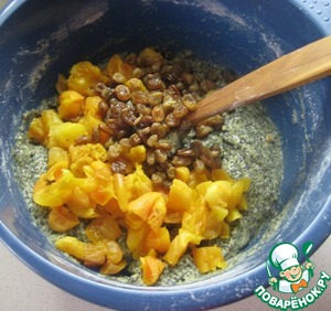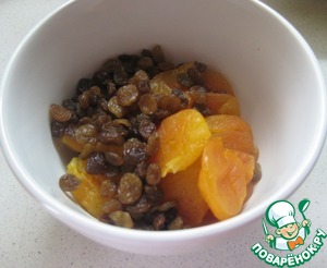 Изюм и курагу залить горячей водой, дать постоять минут 10, затем воду слить, обсушить бумажным полотенцем. Курагу нарезать небольшими кусочками.
