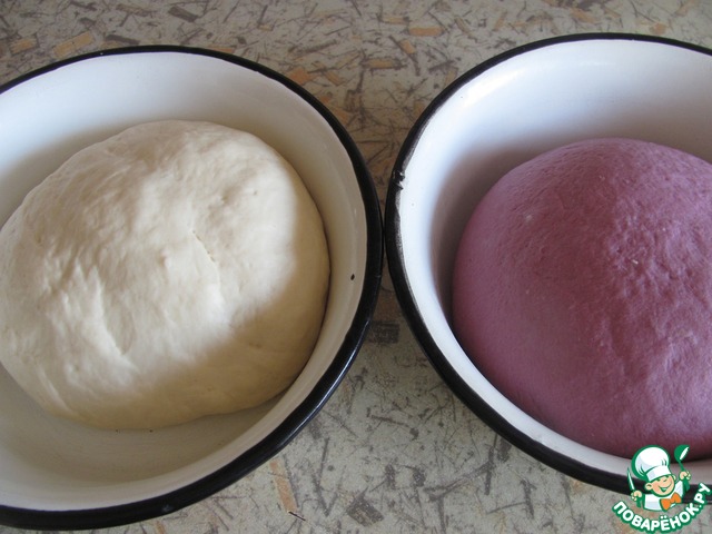 Белое тесто я замешивала в ХП (5*5*7), а фиолетовое-руками. Тесто не липнет плотное, но не тугое. Кладем тесто в посуду, накрываем и ставим бродить при температуре 27-28 градусов 45-50 минут. -