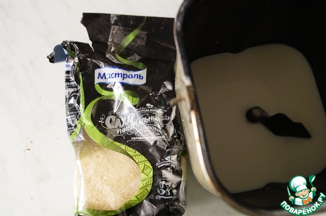 Я замешивала тесто в хлебопечке. Для этого наливаем в чашу теплое молоко, добавляем соль, растительное масло и сахар.