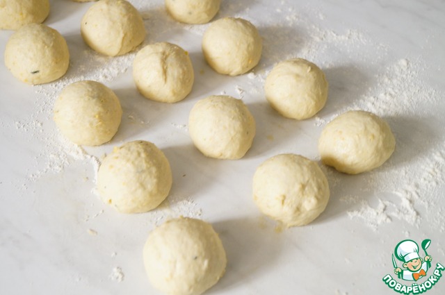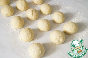 Выкладываем готовое тесто на стол и делим на небольшие части и скатываем в шарики.