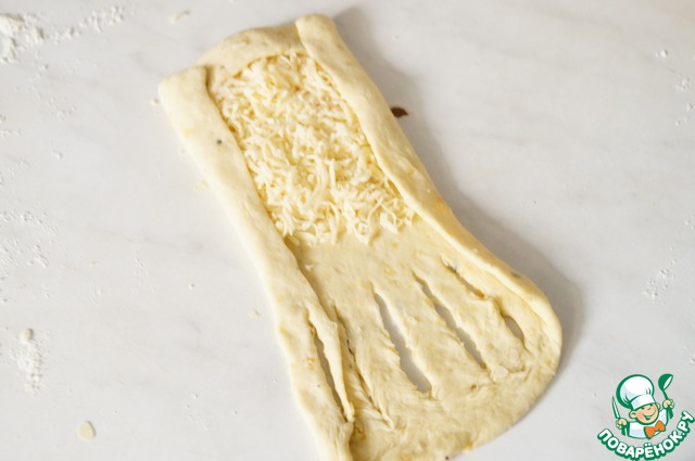 Берем один шарик и раскатываем из него широкую полоску. На один край распределяем немного тертого сыра, загибаем края, чтобы сыр не вытек. Другой край надрезаем полосками, но не до конца.