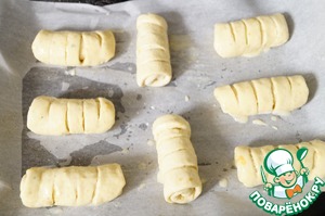 Сворачиваем рулетиком и выкладываем на противень, застеленный пергаментом. Подготовленные булочки смазываем взбитым яйцом и выпекаем в разогретой до 180 гр духовке до румяной корочки.