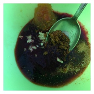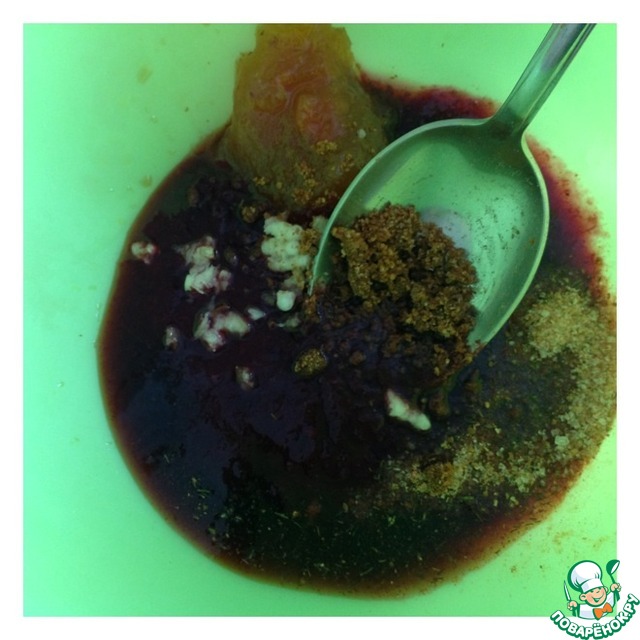 В посуду для маринования влить ткемали и бальзамический уксус, добавить абрикосовый джем (можно апельсиновый или лимонный, если ничего нет, то пойдет и мед, но вкус уже будет не тот).