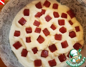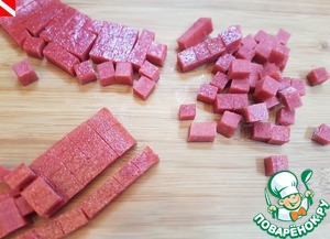 Клубничное желе достать из морозилки, вырезать из формы. Нарезать кубиками 1*1 см.