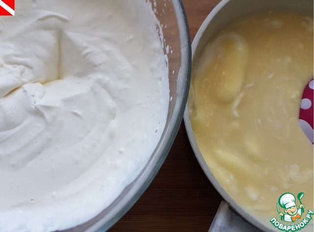 Охлажденные сливки взбить до пышности. В несколько приемов аккуратно смешать с остывшим заварным кремом.