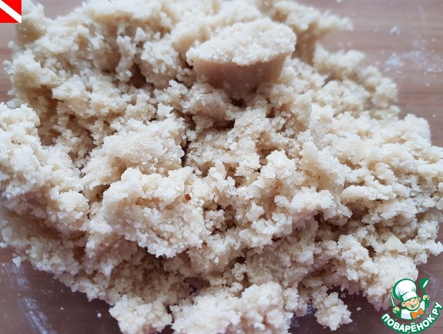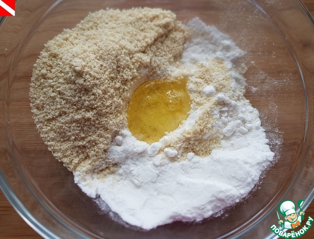 Приготовить марципан - миндальную муку (молотый миндаль), сахарную пудру и белок (20 г) хорошо перемешать. -