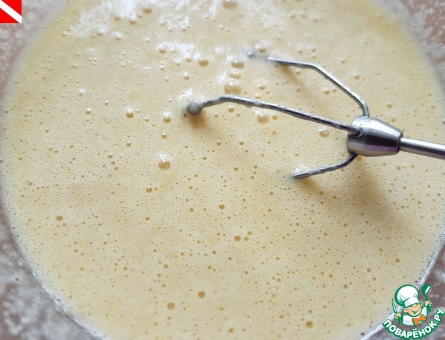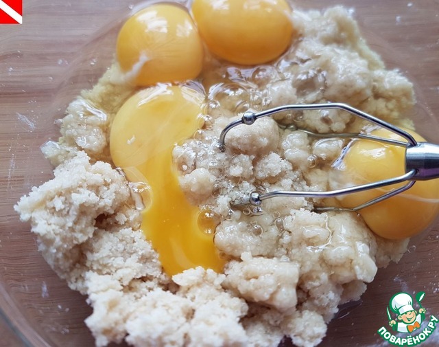 Добавить яйца. Всего у меня ушло 4 целых яйца категории "О" ( = 20 г белка и 210 г яиц). Хорошо размешать венчиком.