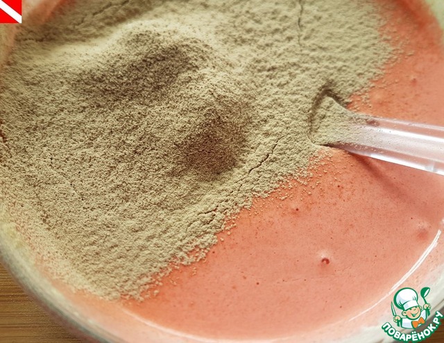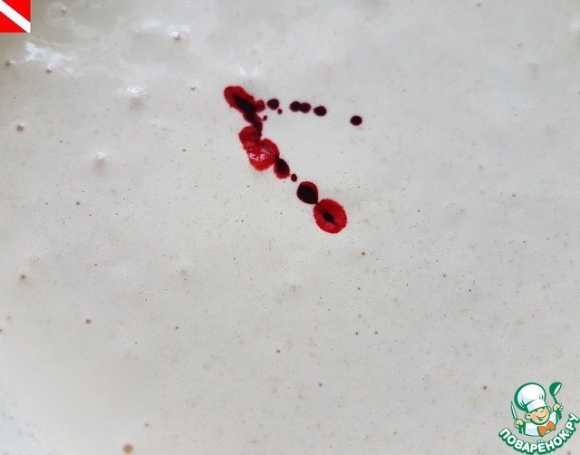 Добавить красный краситель, перемешать. Краситель льем на свой вкус. Я стараюсь для семейного употребления много не использовать. Еще следует учитывать, что и какао свой оттенок даст. В классическом рецепте торта Красный Бархат, того, что подавали в начале 20 века в знаменитом отеле Нью-Йорка Уолдорф-Астория краситель не использовался - красный цвет бисквиту придавала химическая реакция между пахтой и антоцианами в какао. Сейчас же какао-порошок подвергается голландской обработке, а она нейтрализует антоцианы.