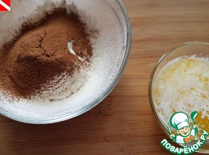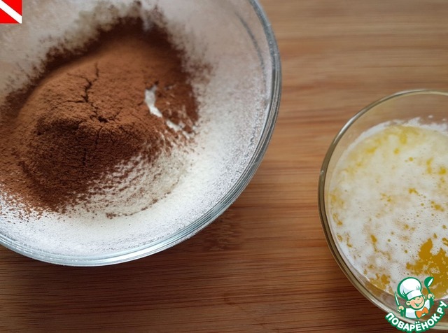 Муку смешать с какао и разрыхлителем, просеять. Масло растопить и остудить до 70 градусов.