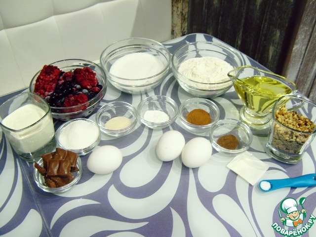 Подготовим ингредиенты. Просеем муку. Просушим, переберем орехи и измельчим их. Разморозим ягоды. Ставим духовку разогреваться до 180 градусов.