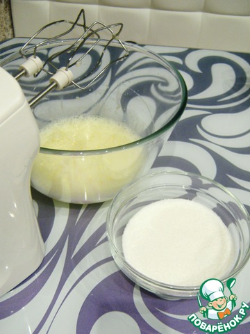 Не прекращая взбивать, аккуратно добавляем сахарный песок. Продолжаем взбивать.