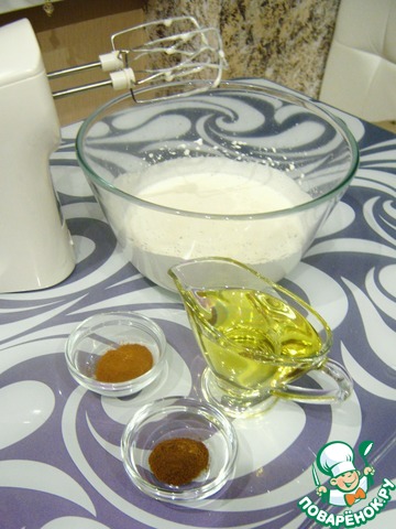Яичная масса должна приобрести однородный белый цвет. В неё отправляем подсолнечное масло, корицу, мускатный орех и соль. Продолжаем взбивать.
