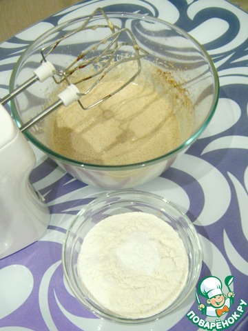 Просеянную муку и разрыхлитель отправляем в ёмкость с тестом. Взбиваем до однородности.