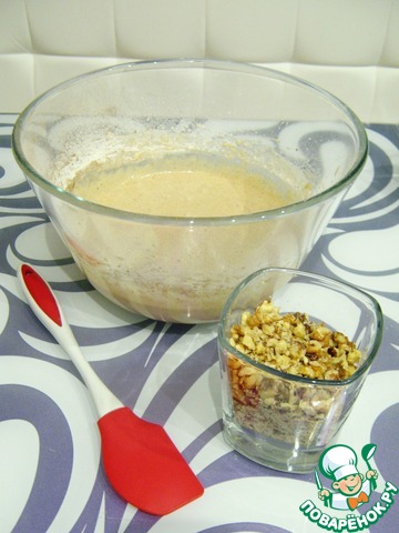 В тесто всыпаем перебранные (если хотим остаться с зубами) и измельчённые грецкие орехи. Перемешиваем тесто лопаткой.