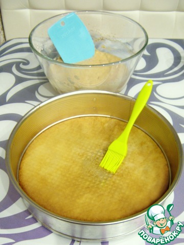 Даём ему остыть 20 минут. Я предпочитаю мокрые коржи, поэтому пропитываю его вишнёвым соком (не сильно, чтобы мусс не поплыл) -