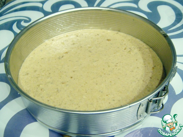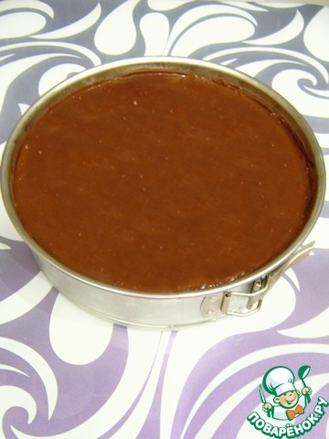 Вливаем тесто в форму для выпечки. Разравниваем. Несколько раз ударим форму о стол, чтобы масса ровно легла в форме. Отправляем корж в духовку, разогретую до 180 градусов на 20-25 минут.