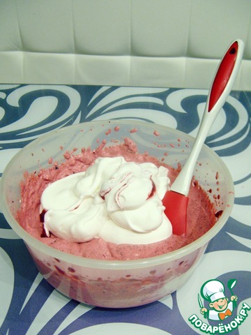 Вводим взбитые с сахаром белки в ягодно-сливочную смесь. Аккуратно перемешиваем сверху вниз до однородности.