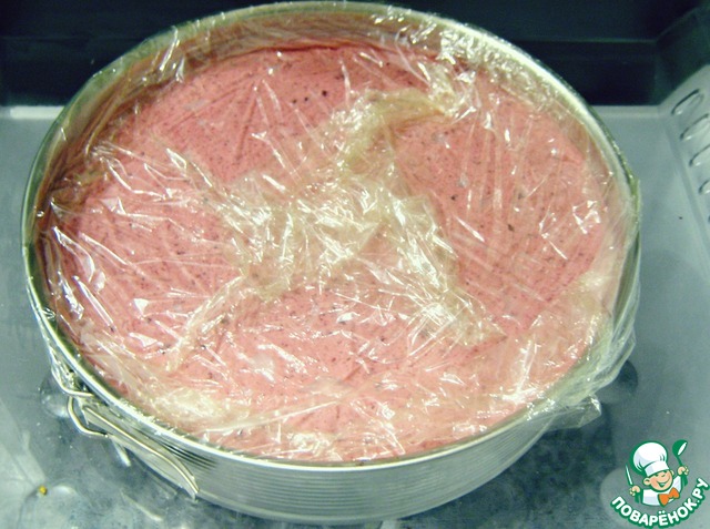 Выкладываем ягодный мусс на корж. Разравниваем. Несколько раз ударяем по столу формой, чтобы масса распределилась равномерно и вышли лишние пузырьки. Заворачиваем форму с тортом в пищевую плёнку и отправляем в морозилку на 1 час.