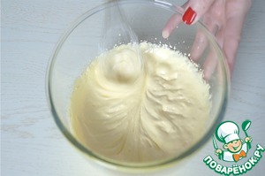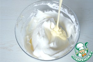 • 1. Отделяем белки от желтков. Белки взбиваем в пену, затем добавляем половину сахара и ещё раз взбиваем до устойчивых пиков