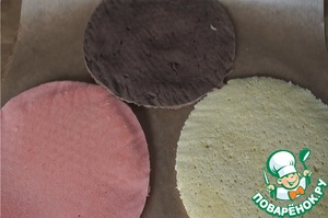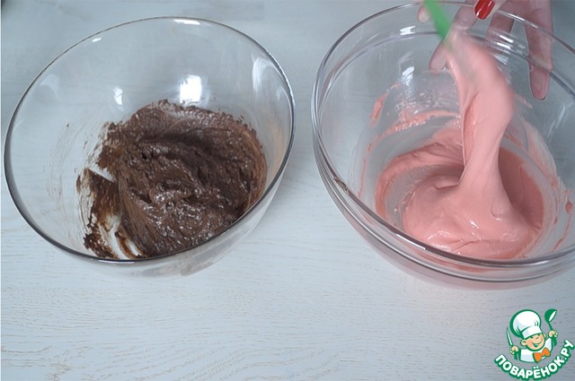 • 5. Тесто делим на три равные части: в одну часть добавляем какао-порошок, перемешиваем; в другую - краситель (или сок свеклы)