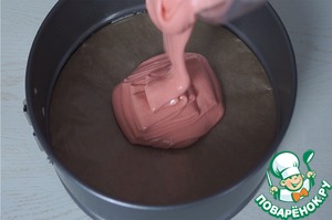 • 9. Собираем торт: шоколадный корж сначала пропитаем кофе (остывшим), затем сметанным кремом, далее розовый корж, пропитка, крем и оставшийся светлый корж, пропитать и промазать верх и бока кремом