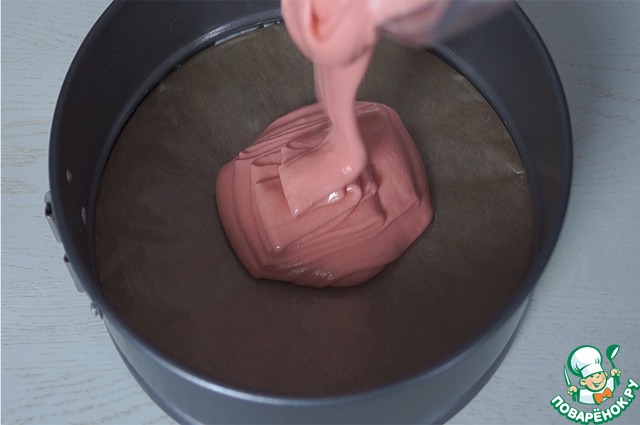 • 6. Тесто выкладываем в форму ( у меня диаметр 20 см), застеленную пергаментом. Выпекаем все коржи в разогретой до 180°С духовке до готовности ( у меня выпекался примерно 20 мин)
