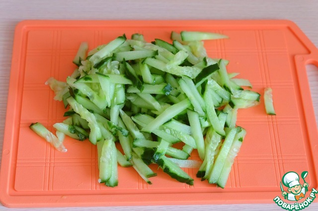 Свежий огурец нашинковать соломкой.