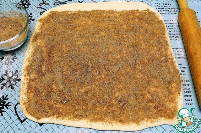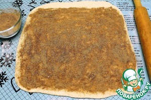 Тесто раскатываем в пласт толщиной примерно 0,7-1 см. Тесто смазываем растительным маслом и присыпаем сахаром с корицей, оставляем один край свободным.
