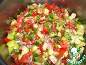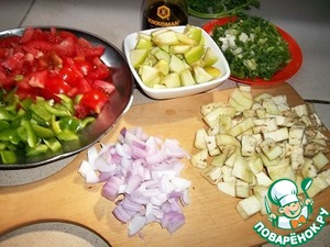 Все овощи и яблоко нарезать небольшими кубиками (с баклажана снять кожицу). Зелень порубить. Из лайма (или лимона) выжать сок.