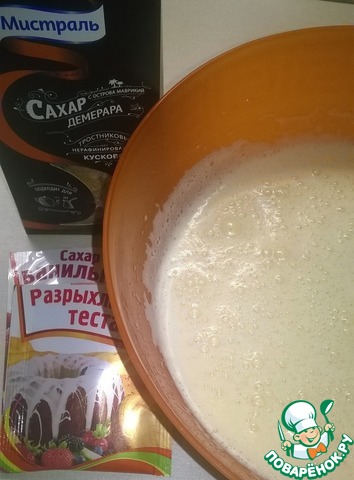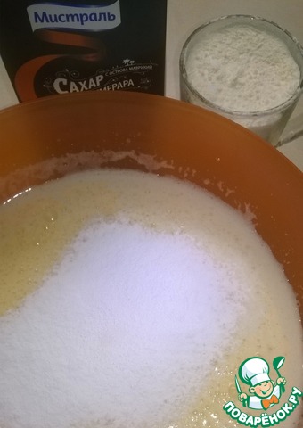 Взбить яйца в пену. Добавить полстакана белого сахара и полстакана сахара тростникового ТМ Мистраль. У меня сахар Демерара кусковой, у него более насыщенный вкус. Я его перемалываю или толку просто в стакане. Не пугайтесь моих объемов, я делала двойную порцию на всю родню.