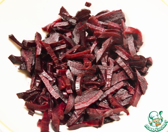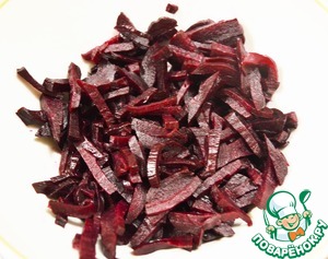 Готовим свёклу. Можете сварить, но полезнее испечь. У меня была запечёная. Нарезаем её соломкой.