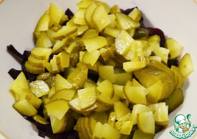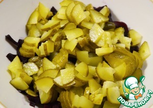 Маринованный огурчик мелко нарезаем.