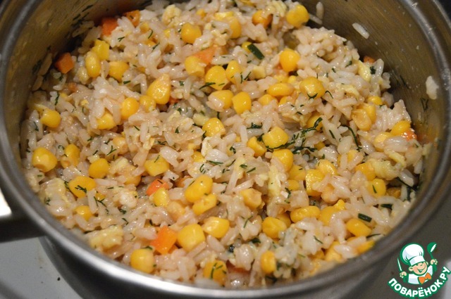 • В готовый рис добавляем соевый соус, овощи, омлет и мелко порезанную зелень. Все перемешиваем. Накрываем крышкой и даем настояться около 10 минут.