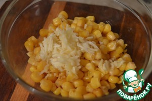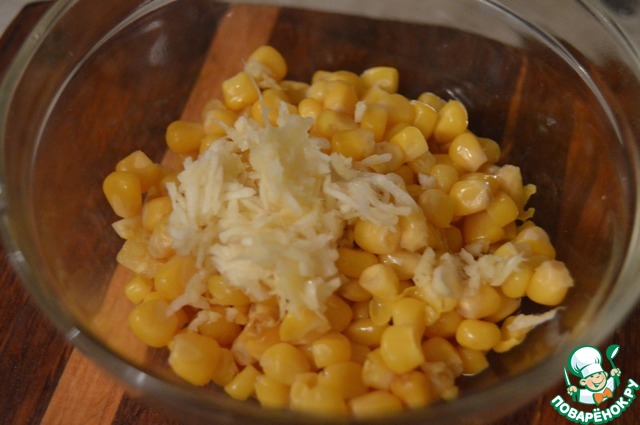 • Добавляем кукурузу, а так же натертые чеснок и имбирь.