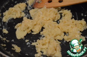 • В сковороду выливаем взбитые яйца и готовим на среднем огне, помешивая, до загустения. Снимаем приготовленный омлет в миску.