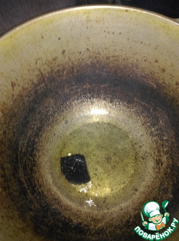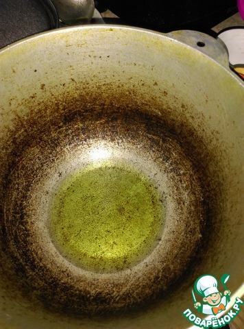 Казан (именно казан, а не кастрюлю, в крайнем случае - утятницу или чугунную сковороду с высокими бортами) ставим на сильный огонь и нагреваем. Потом в нагретый казан наливаем примерно 120-130 граммов масла и оставляем его прокаливаться Даже если оно рафинированное, все равно греем до того, чтобы дым пошел.