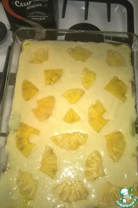 Выливаем тесто на яблоки и сверху раскладываем ананас. Отправляем в духовку, выпекаем при 180 градусах С 50 минут. А вообще смотрите по своей духовке, до сухой лучины.