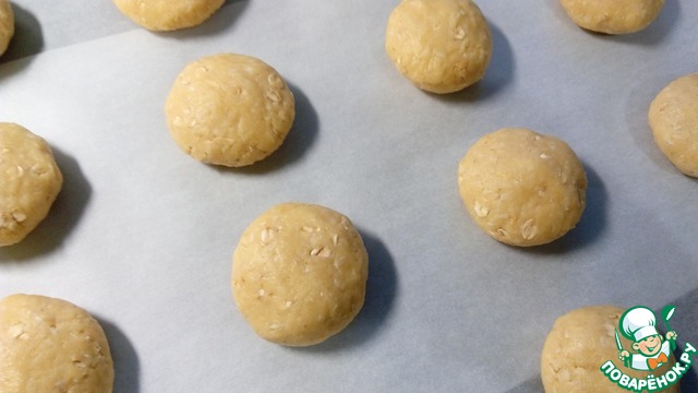 Скатать шарики, немножко их сплющить, выложить на противень и испечь в духовке 20-30 минут при температуре 180 градусов.