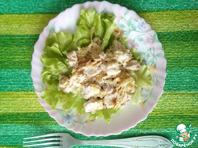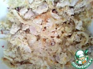 В салатник выкладываем редьку с луком и свинину. Солим, перчим по вкусу и заправляем майонезом. Я не очень люблю майонез, поэтому развожу майонез со сметаной в равных долях. Но это дело вкуса.