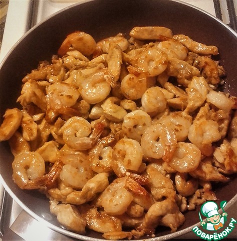 Обжарьте с небольшим количеством масла в большой сковороде (воке) или сотейнике куриное филе интенсивно помешивая, в течение 3 минут, затем добавьте креветки и готовьте до легкой золотистой корочки не более 3 минут. Выложите курицу с креветками к обжаренным яйцам.