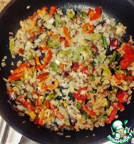 Добавьте к луку болгарский перец, нарезанный полосками или небольшими кубиками. Обжарка должна быть быстрой: не более 3 минут.