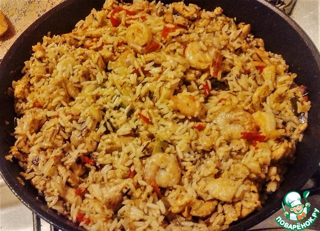 Интенсивно перемешайте, добавьте к овощам обжаренную курицу, креветки, яйца, перемешайте. Добавьте рис и приготовленный заранее соус-заправку. Перемешайте осторожно лопаткой, чтобы весь рис оказался пропитанным соусом. Накройте крышкой, подержите на среднем огне ещё минуту затем выключите огонь и подержите под крышкой ещё минут 10-15, чтобы рис пропитался соусом.