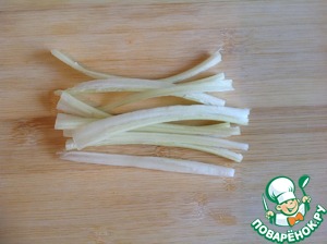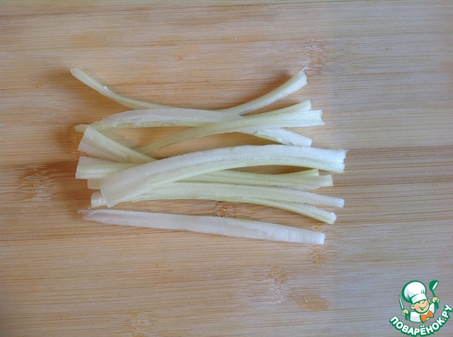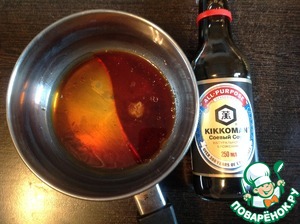 Сначала приготовим соевый дип-соус. Масло налить в сотейник, добавить соевый соус, мед. Имбирь потереть на мелкой терке и отжать – сок (1 ч. л.), влить в сотейник. Все перемешать до однородного состояния. Сотейник поставить на медленный огонь, всыпать крахмал, хорошо перемешать и варить, помешивая, до загустения – закипеть при этом соус не должен. Остудить.