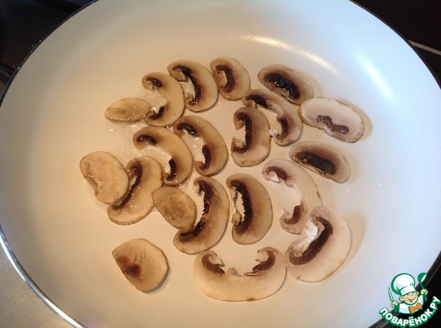 В сковороду налить растительное масло, поставить на огонь. Подготовленные шампиньоны добавить в сковороду и пожарить 7-8 минут до выпаривания всей жидкости. Снять с огня и остудить.