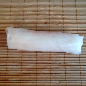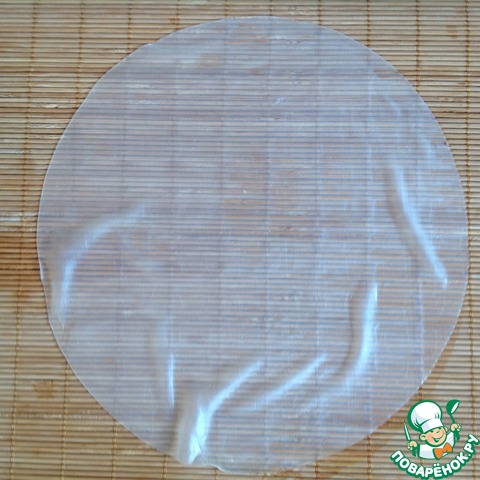 Замочить лист рисовой бумаге вмиске с горячей воде примерно на 10 секунд, пока он не станет элпстичным и податливым.