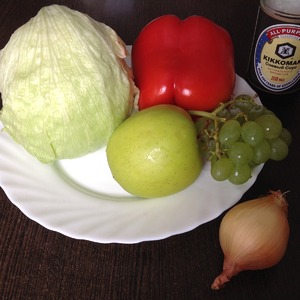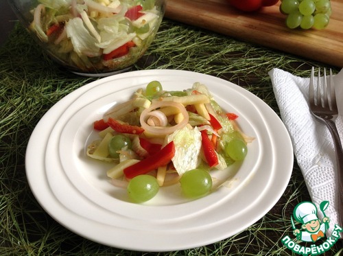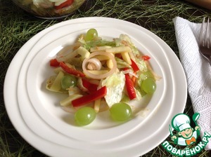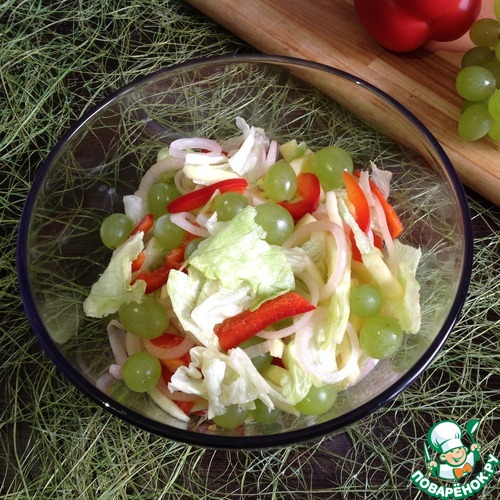 Добавляем яблоко, болгарский перец, лук, снова аккуратно перемешиваем. Поверх выкладываем виноград и сразу подаем. Приятного аппетита!