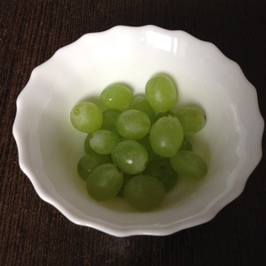 Ягоды винограда разрезаем пополам, удаляем косточки. У меня мелкий без косточек, я его оставила целиком.